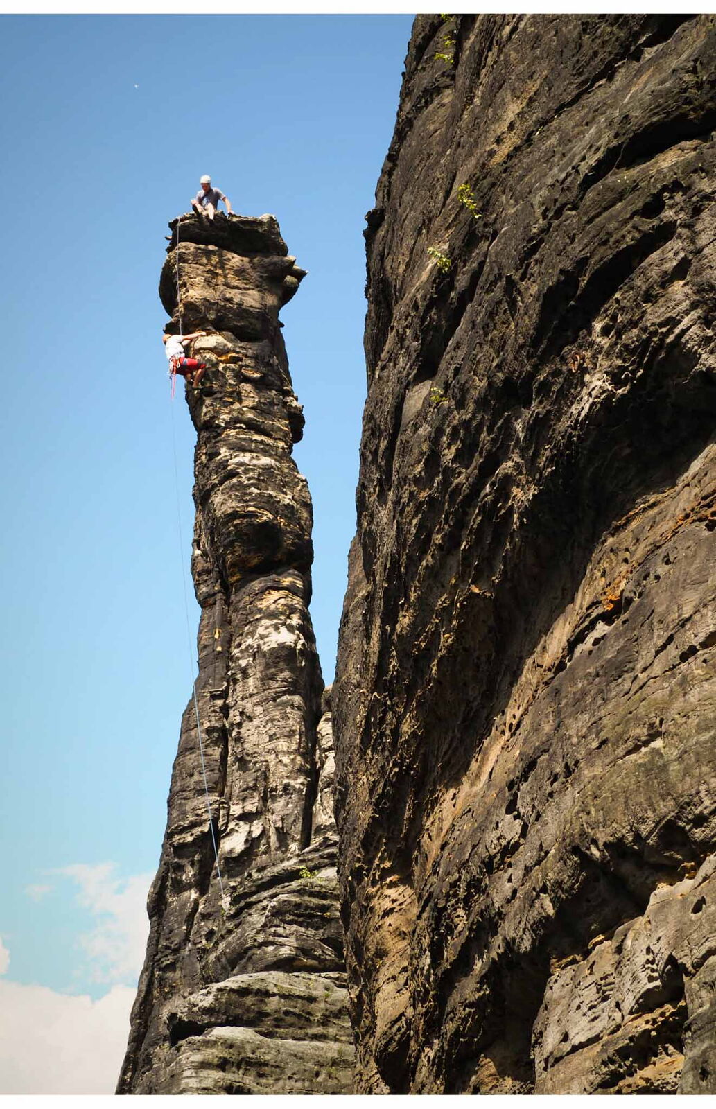 Charakteristisch für das sächsische Klettern ist die bewusst reduzierte Absicherung: