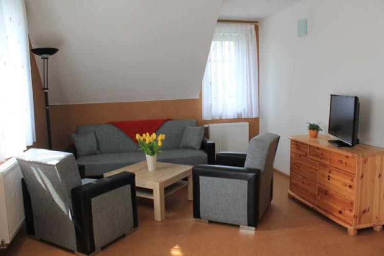 - Wohnraum mit komplett ausgestatteter Küche (Geschirrspüler, Herd mit Backröhre, Kaffeemaschine, Toaster, Wasserkocher, vollständige Kochtopf-, Tiegel- und Geschirrausstattung) und Wohnbereich mit SAT-TV+Radio, Eßtisch und Polstersitzgruppe (Sofa als eine zusätzliche Aufbettung nutzbar)