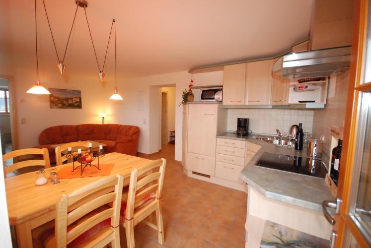 Wohnzimmer mit Einbauküche eingerichtet mit elektr. Geräten, 2 getrennte Schlafzimmer, Panoramaterrasse, DU/WC, Bettwäsche + Handtücher, SAT-TV, DVD, Telefon, Grill, Kinderspielgeräte,