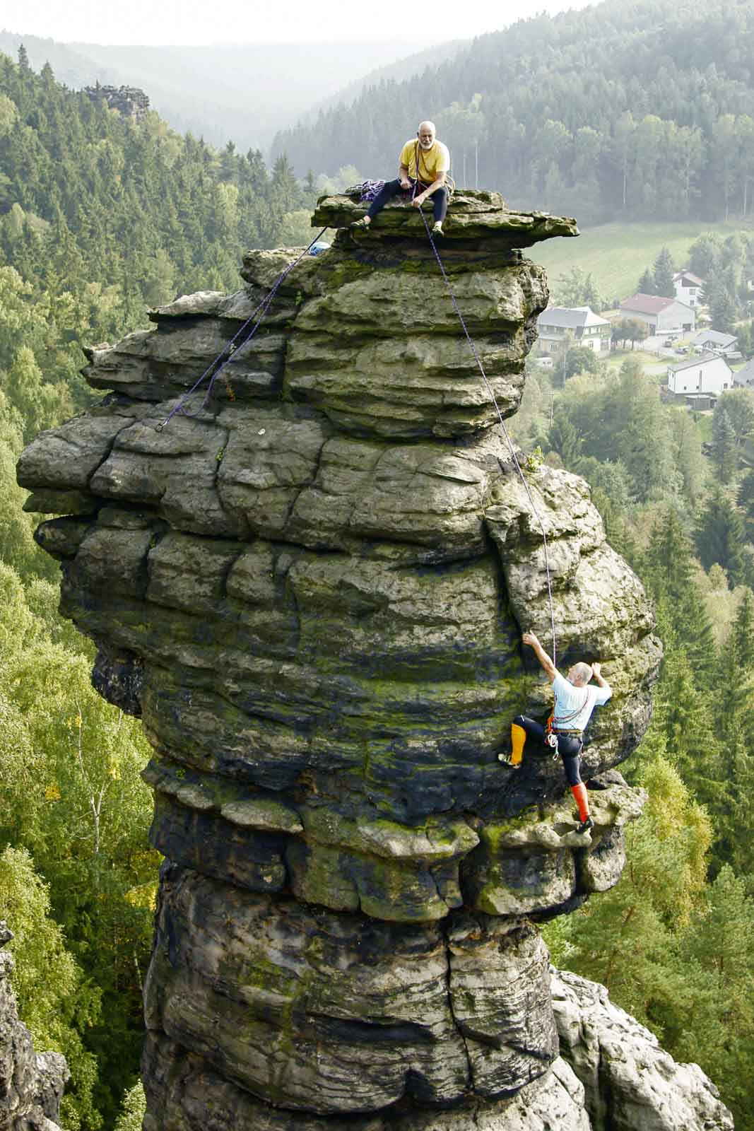 Charakteristisch für das sächsische Klettern ist die bewusst reduzierte Absicherung:
