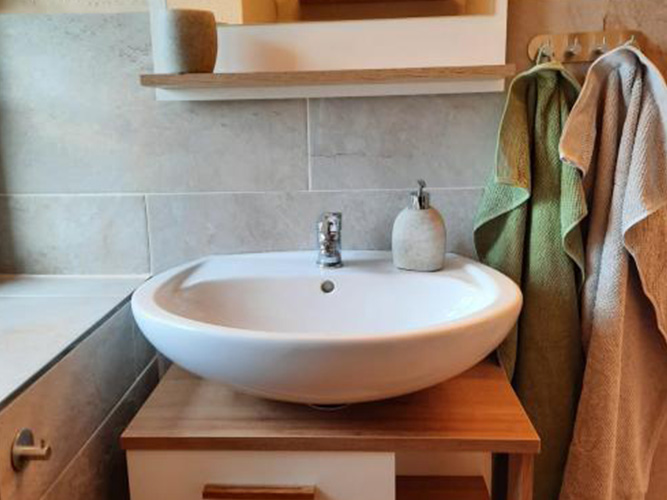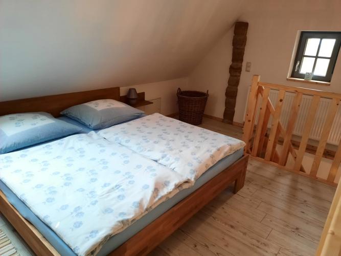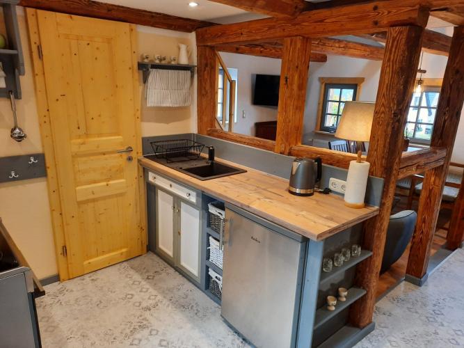 Die Ferienwohnung Franz befindet sich im Erdgeschoss unseres Hauses in der ehemaligen Schmiede. Auch zu ihr gehört ein eingezäunter Außenbereich mit einer Terrasse. Auf den rustikalen Möbeln kann man gemütlich im Sonnenschein frühstücken oder bei einem Glas Wein den Urlaubstag ausklingen lassen. Die Wohnung besitzt einen Flur mit einem geräumigen Kleiderschrank, einer Garderobe und einem Spiegel. Für zwei Personen sind die ca. 40 m² perfekt ausgestattet. Die Küche besitzt einen Herd mit Backofen, Abzugshaube, Kühlschrank mit Tiefkühlfach, Geschirrspüler, Toaster, Kaffeemaschine, einen Wasserkocher und alle Utensilien, die man in der Küche so braucht. Im Wohnzimmer befindet sich ein bequemer Essplatz und eine Couch, die bei Bedarf in ein Doppelbett (1,40m x 1,90m) , umgewandelt werden kann. Natürlich ist auch hier ein Smart-TV vorhanden und WLAN verfügbar. Das Schlafzimmer ist nicht sehr groß. Mit dem im „Vintage – Stil“ aufgearbeiteten und mit neuen Lattenrosten sowie Matratzen ausgestatteten Doppelbett aber sehr gemütlich! Eine Dusche, ein WC und das Handwaschbecken im „Retro-Stil“ passen gut in das Ambiente dieser Wohnung. Ihren Charakter erhält sie durch den freigelegten Sandstein und die mit Liebe zum Detail ausgestatteten Räume. Ab 16 Uhr kann die Wohnung bezogen- und am Abreisetag bis 10 Uhr verlassen werden. Das Parken ist direkt am Haus auf dem eigenen Parkplatz möglich. Für unsere Urlauber, welche mit einem E-Auto anreisen, bieten wir die Nutzung einer Wallbox an.