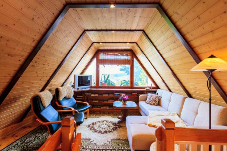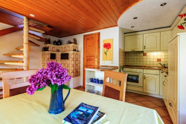 Gemütliche Wohnküche mit Kachelofen. Treppenaufgang zu Wohn- und Schlafzimmer.