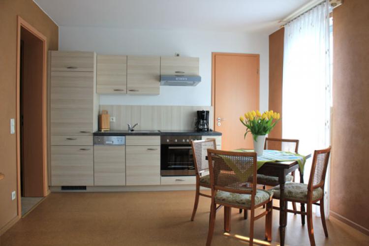 - Wohnraum mit komplett ausgestatteter Küche (Geschirrspüler, Herd mit Backröhre, Kaffeemaschine, Toaster, Wasserkocher, vollständige Kochtopf-, Tiegel- und Geschirrausstattung) und Wohnbereich mit SAT-TV+Radio, Eßtisch und Polstersitzgruppe (Sofa als eine zusätzliche Aufbettung nutzbar)
